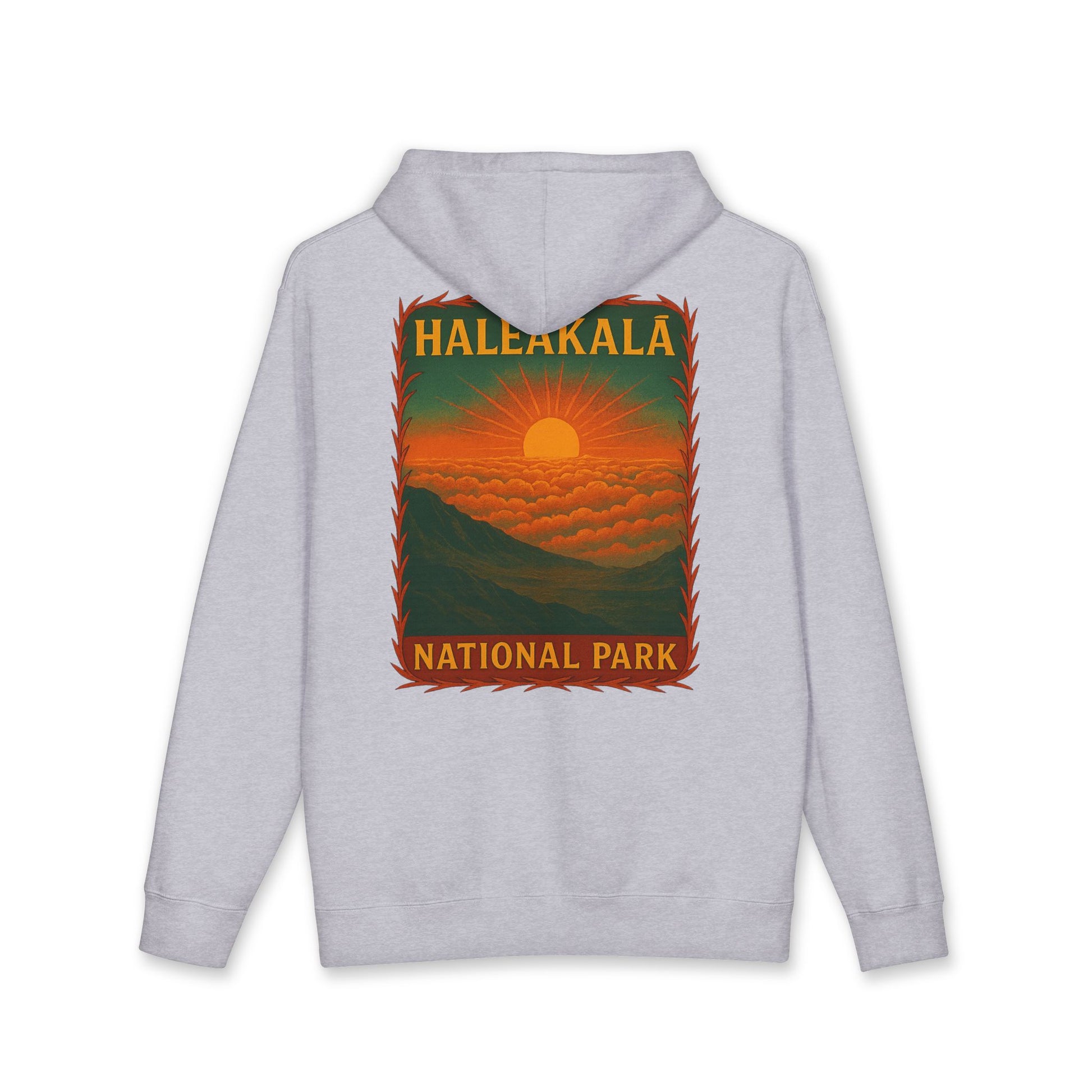 This heavyweight hooded sweatshirt wraps you in calm mornings and slow, wide-open skies. Soft, substantial fabric and a fleece-lined hood give a grounded warmth that feels like pulling on a quiet sunrise. The front’s small, script logo sits low-key and personal, while the back features a vintage-style Halekala National Park scene — molten sun sinking into layered clouds and ridgelines — so the hoodie reads like a wearable postcard from a lone mountain lookout. It fits roomy for layering over tees or flannels, breathes well thanks to a cotton blend, and wears like a lived-in favorite as the seams and ribbed cuffs hold shape through seasons. Reach for it on cool dawn hikes, early-train commutes, or slow weekend drives when you want something both resilient and quietly expressive.