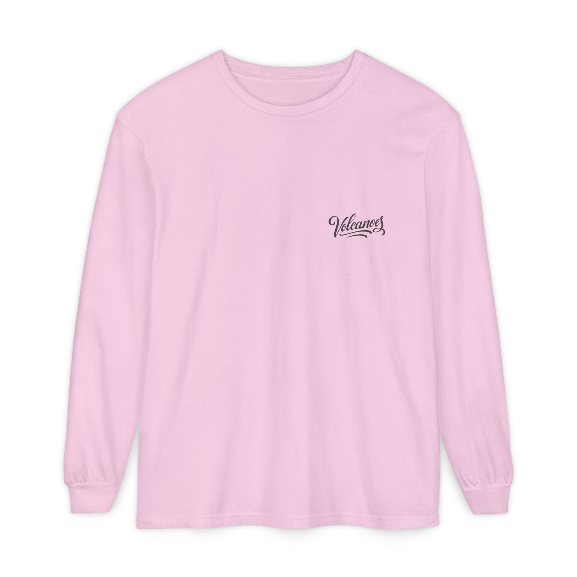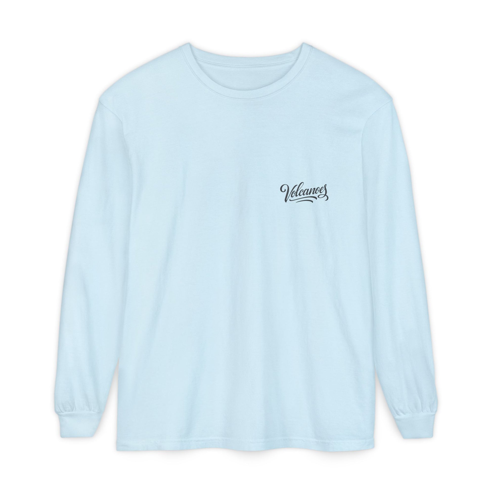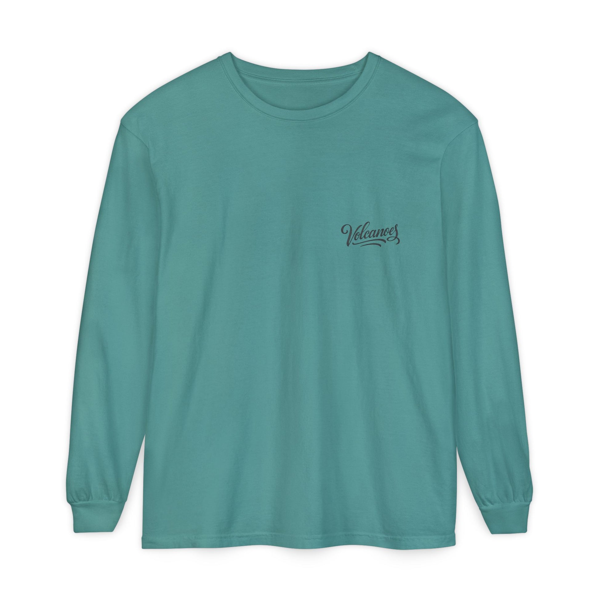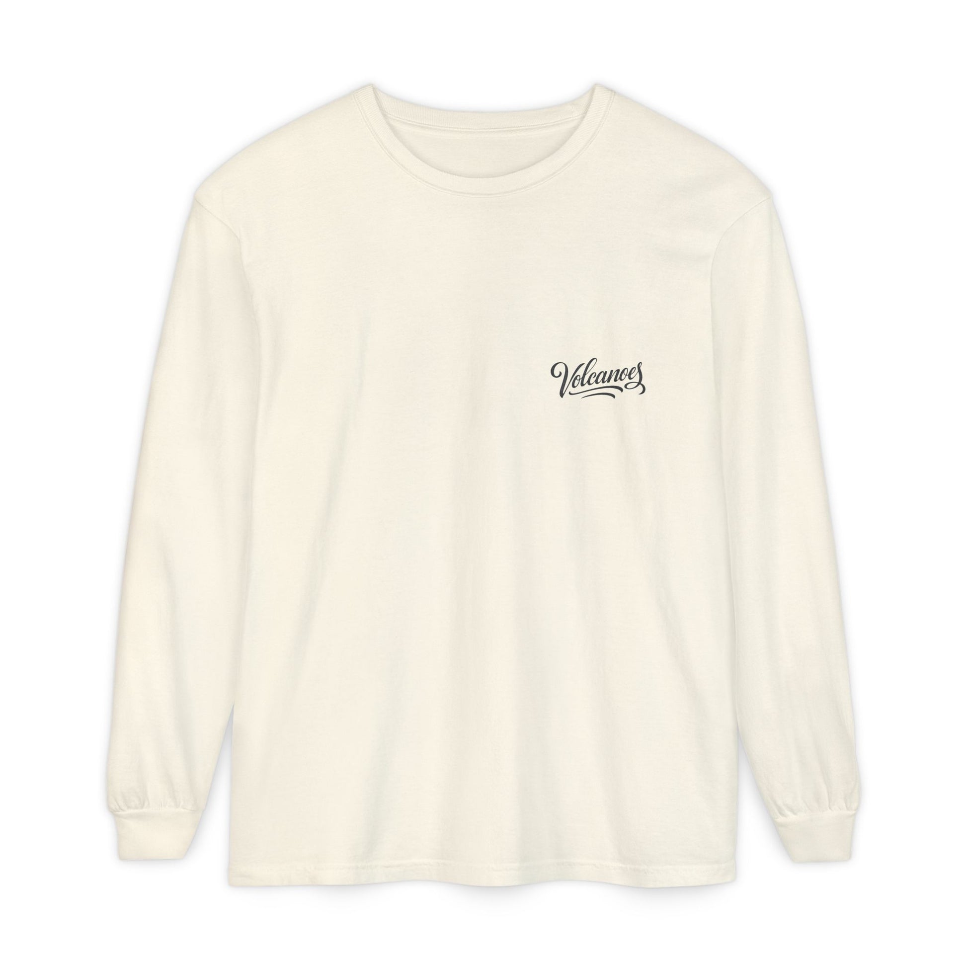 This garment-dyed long sleeve carries a vintage national park vibe—soft, slightly broken-in color with a bold, travel-poster print of an erupting volcano on the back and a small scripted logo at the chest. The medium-weight ring-spun cotton feels substantial yet worn-in right away. Ribbed cuffs and reinforced neck and shoulder tape keep the shape through regular wear. Wear it on cool mornings at the trailhead, while planning the next road trip, or layered under a jacket for city walks. It reads like a loved tee passed down from an adventurous friend—comfort-first, with a story-driven graphic that stands out without shouting.