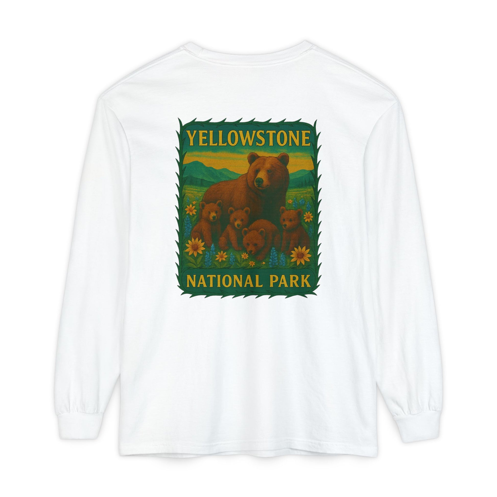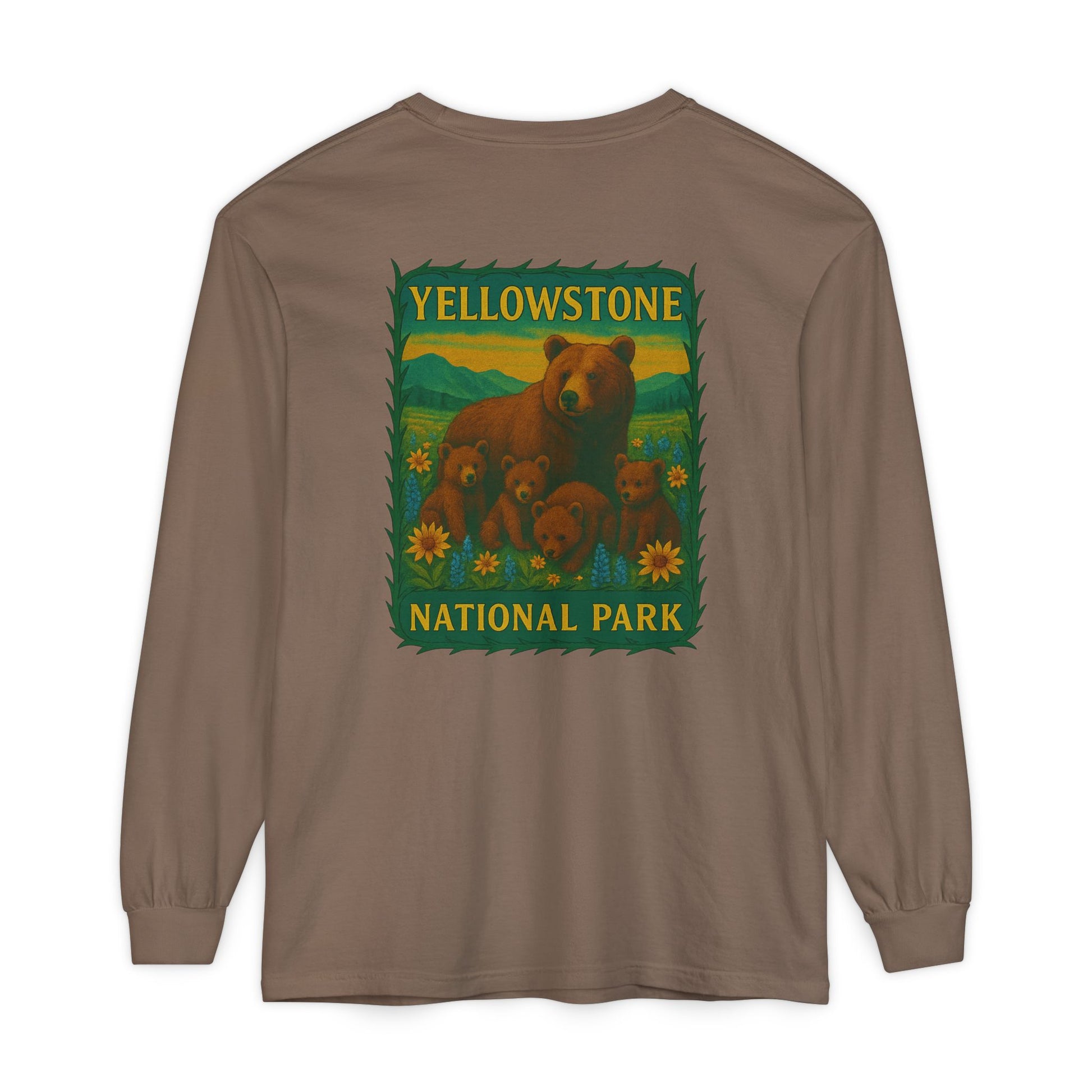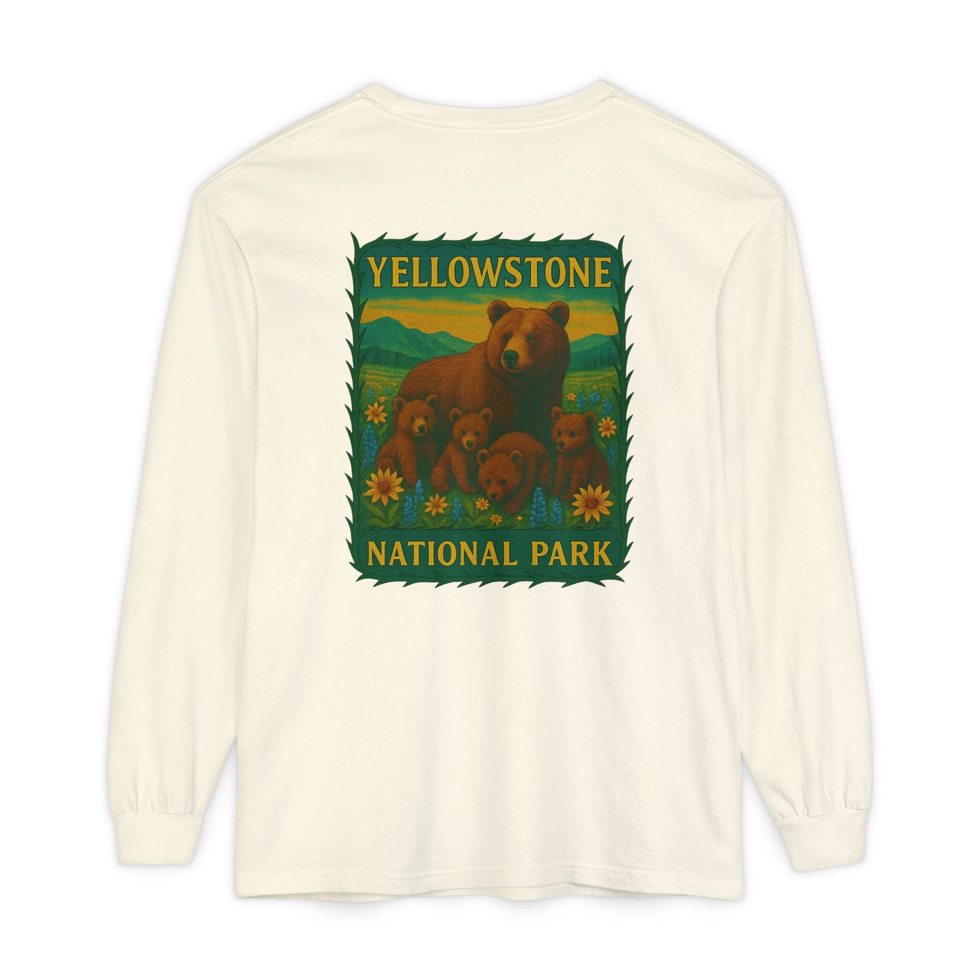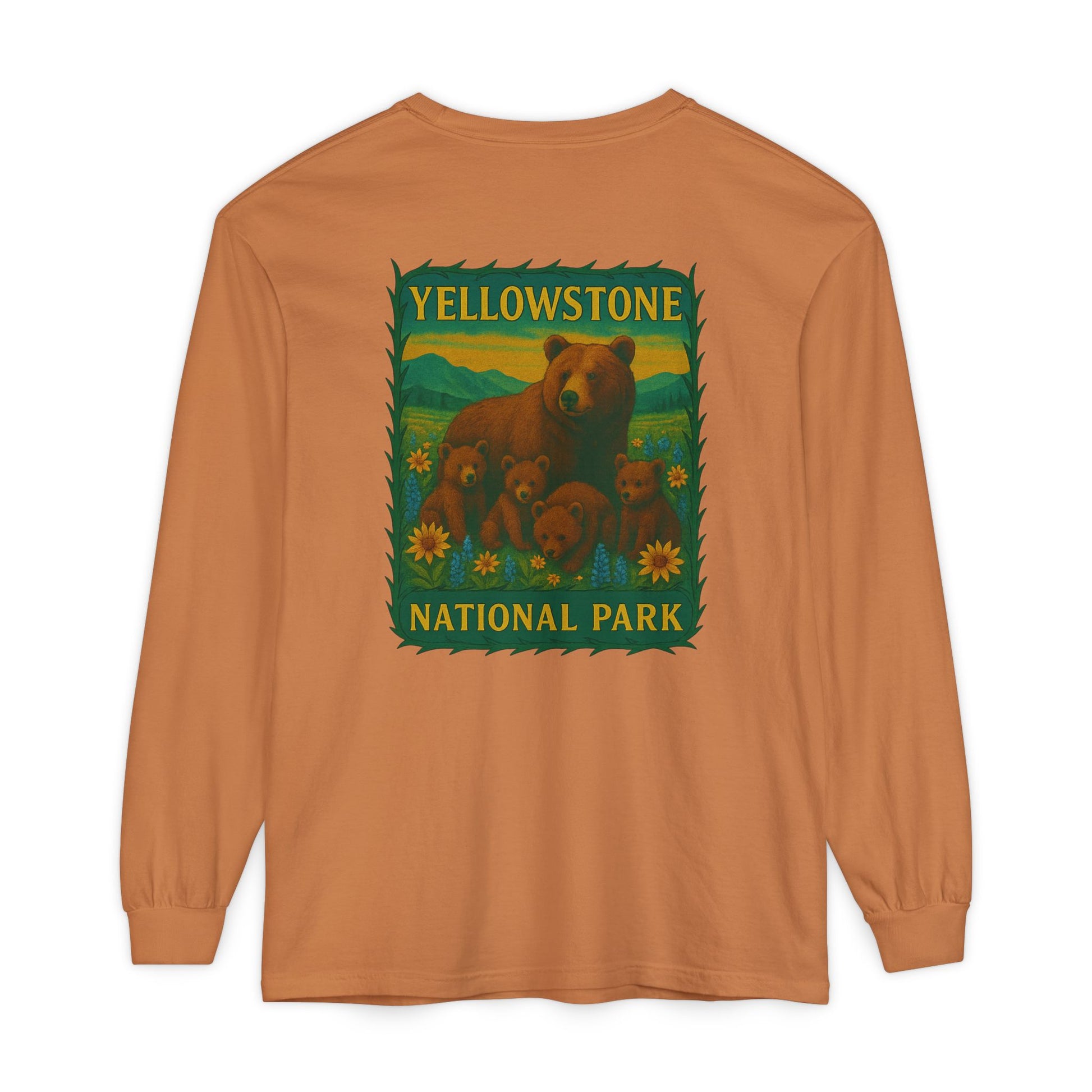 A soft, lived-in long sleeve that feels like it’s already been on your favorite trail. This garment-dyed tee brings cozy texture and warm color to a classic fit, while a vintage-inspired Yellowstone graphic of a bear family and wildflowers anchors the back in nostalgic park style. Lightweight but substantial, the ribbed cuffs and reinforced neck and shoulders keep the shape through hikes, campfire talks, and lazy weekends. Wear it layered under a flannel, over a tank, or solo when you want a quiet, nature-forward statement that ages beautifully with every wash.