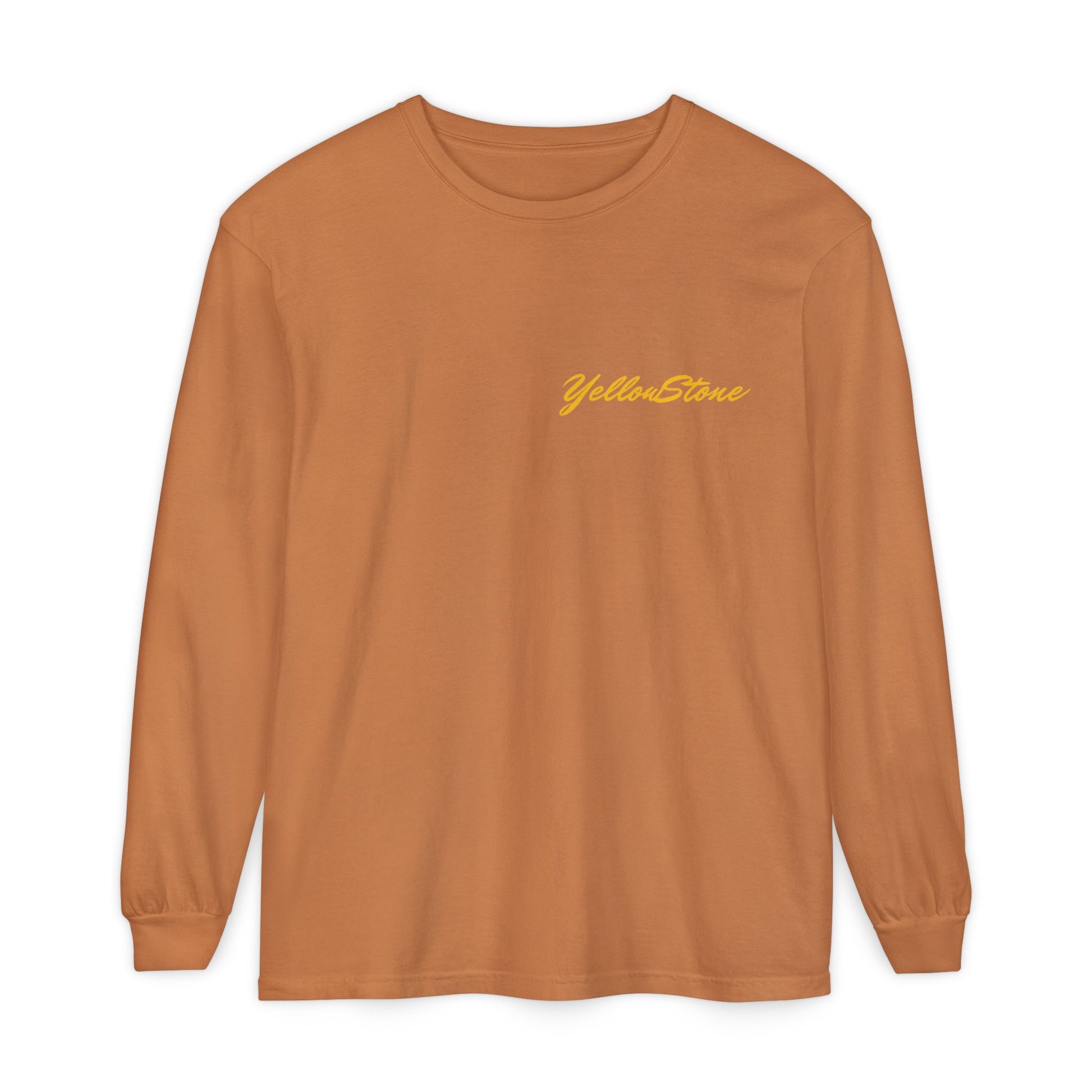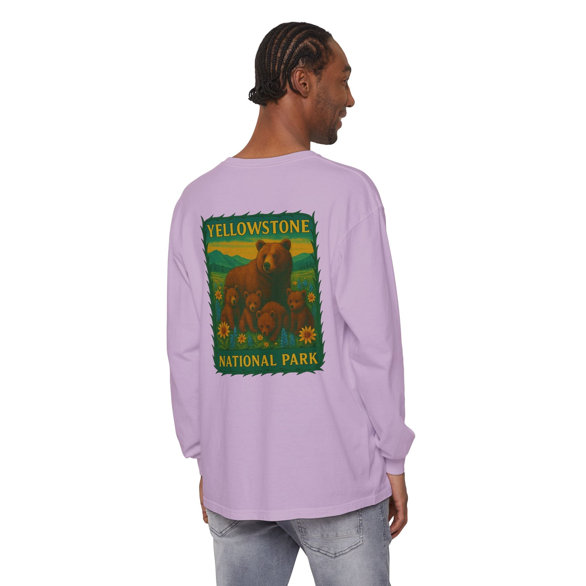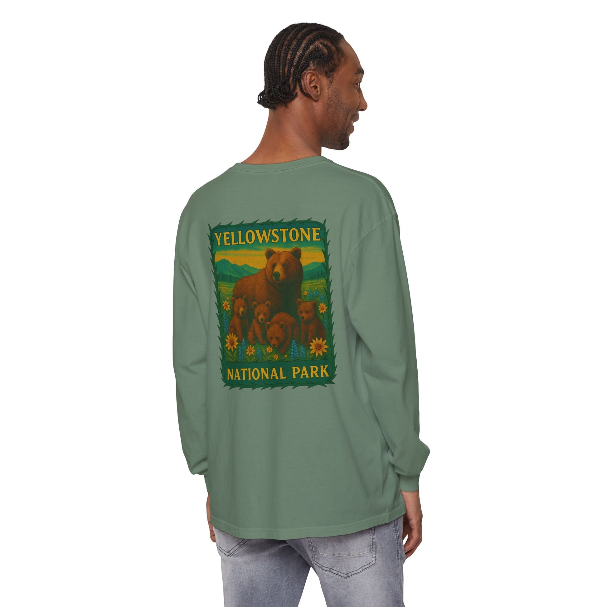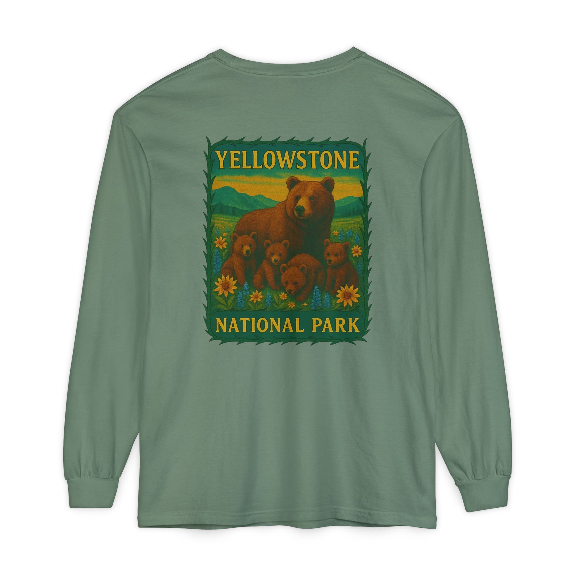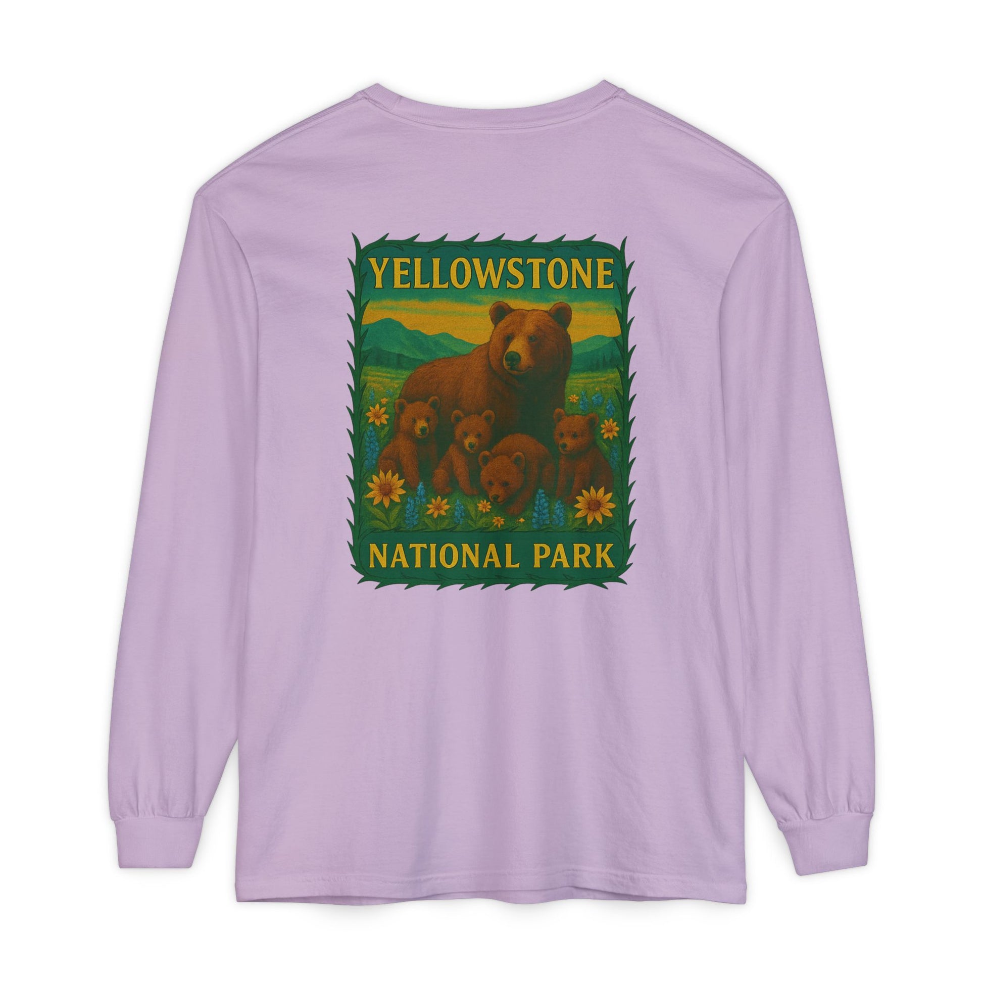 A soft, lived-in long sleeve that feels like it’s already been on your favorite trail. This garment-dyed tee brings cozy texture and warm color to a classic fit, while a vintage-inspired Yellowstone graphic of a bear family and wildflowers anchors the back in nostalgic park style. Lightweight but substantial, the ribbed cuffs and reinforced neck and shoulders keep the shape through hikes, campfire talks, and lazy weekends. Wear it layered under a flannel, over a tank, or solo when you want a quiet, nature-forward statement that ages beautifully with every wash.